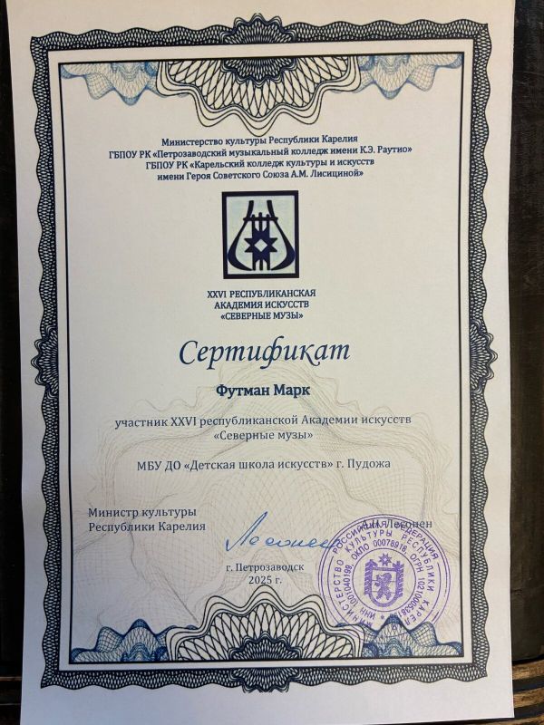 Марк Футман получил Сертификат участника XXVI Республиканской Академии искусств "Северные музы".