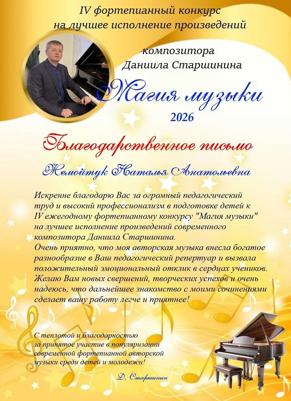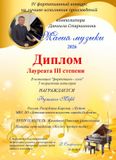 Марк Футман, обучающийся 5 класса "Детской школы искусств" г.Пудожа (преподаватель Н.А.Жемойтук) принял участие в IV фортепианном конкурсе на лучшее исполнение произведений Даниила Старшинина "Магия музыки". С творчеством этого композитора можно ознакомиться в группе Композитор Старшинин Даниил Юрьевич он пишет музыку для фортепиано для солистов и ансамблей разных возрастов. Пьесы Даниила Старшинина звучат интересно, свежо, оригинально, богаты яркими образами. Выступления участников конкурса оценивает сам автор по присланным видео. В этом году более 90 участников из самых разных уголков нашей страны, а также из Белоруссии и Молдовы, приняли участие в конкурсе. Всем победителям присуждается Диплом и денежный приз. Мы очень рады успеху Марка - он стал Лауреатом 3 степени в возрастной группе 14-18 лет. Для исполнения Марк выучил сложную техничную пьесу под названием "Космос внутри тебя". Наши поздравления!