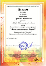 По итогам конкурса работе Кубасовой Елизавете, присвоен диплом 1 степени, Ефимовой Анастасии - диплом 3 степени. Рисунок Елизаветы опубликован в разделе лучшие работы на сайте организатора https://centrideia.ru/node/luchshie-raboty-vserossiyskogo-konkursa-detskogo-risunka-ya-risuyu-krasavicu-osen/.