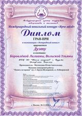 Международный центр поддержки творчества и талантов в г.Москва в декабре этого года проводил Международный вокальный конкурса «ЯРЧЕ ЗВЁЗД» . Культурно-образовательный проект направлен на раскрытие и реализацию талантов детей и молодежи. Конкурс проводился в дистанционном формате, а оценивали участников опытные специалисты в области вокального искусства. Для участия конкурсанты представляли одно произведение любых стилей и жанров. В номинации «Эстрадный вокал» успешно приняли участие обучающиеся по классу эстрадного вокала МБУ ДО «Школа искусств» г. Пудожа Боровлёва Лилиана и Вольская Ульяна. По результатам конкурса вокальный дуэт юных исполнительниц за песню «Память ветеранов» (муз. С.Крупа-Шушариной, сл.И.Яворовской) стали обладателями высокой награды Гран-при.