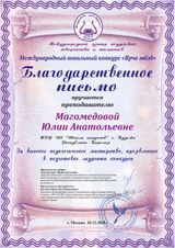 Оргкомитет в письме выразил благодарность преподавателю Магомедовой Юлии Анатольевне за высокое педагогическое мастерство в подготовке победителей конкурса.