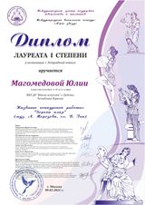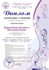 Участие в конкурсе вокального искусства Международного центра поддержки творчества и талантов «ART VICTORY» стало ещё одним достижением для обучающихся «Школы искусств» г. Пудожа Боровлёвой Лилианы, Вольской Ульяны и их опытного преподавателя Магомедовой Юлии Анатольевны. По итогам конкурса, наши вокалистки в очередной раз подтвердили своё мастерство, став лауреатами I степени. Для участия в этом конкурсе была сделана запись новой композиции. Ею стала лирическая песня «В горнице» на музыку А. Морозова и слова Н. Рубцова, отразившая особенности народного фольклора и глубину загадочной русской души.